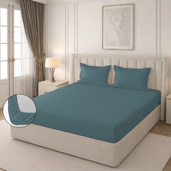MORADO Premium Glace Cotton Stripe Double Fitted Bedsheet With 2 King Size Pillow Covers for Home-Hotels-Guest House (90x100 Inches)