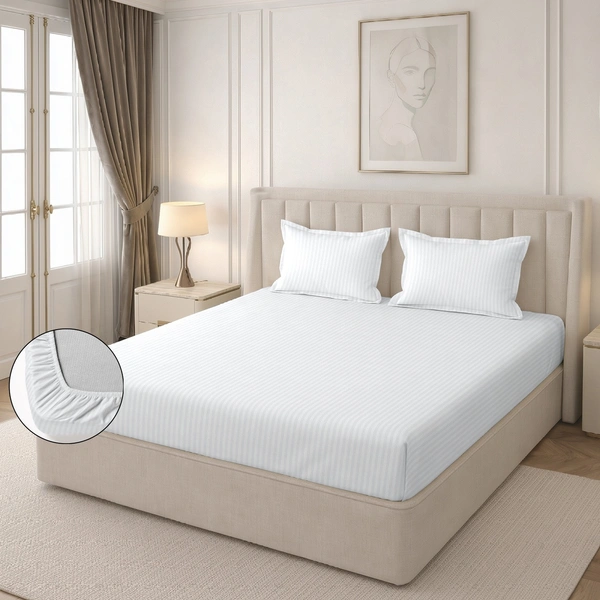 MORADO Premium Glace Cotton Stripe Double Fitted Bedsheet With 2 Pillow Covers for Home-Hotels-Guest House (72x78x8) Inches-White