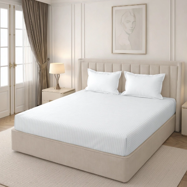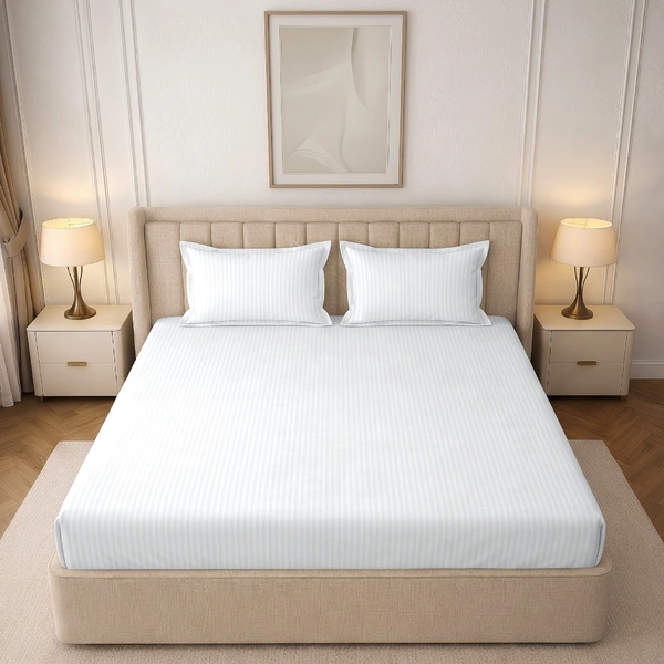 MORADO Premium Glace Cotton Stripe Double Flat Bedsheet With 2 Pillow Covers for Home-Hotels-Guest House (90x100 Inches)-White