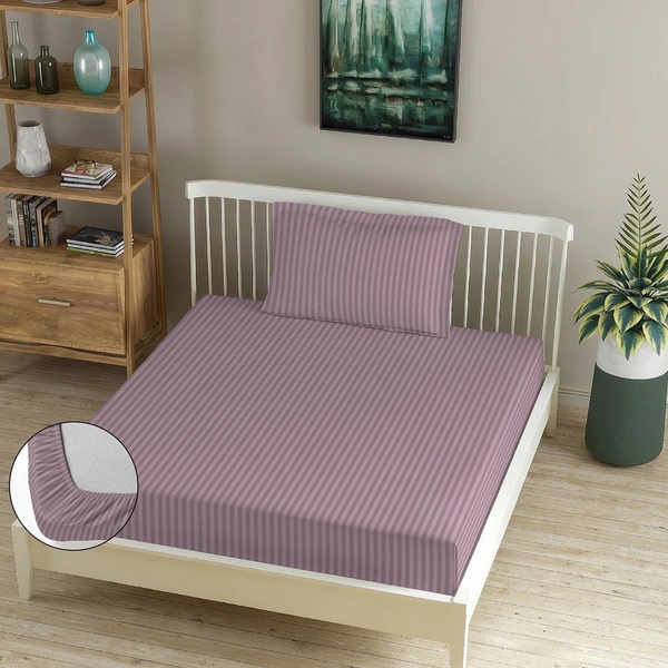 MORADO Premium Glace Cotton Stripe Single Fitted Bedsheet With 1 Pillow Cover for Home-Hotels-Guest House (36x72x8 Inches)-Mauve